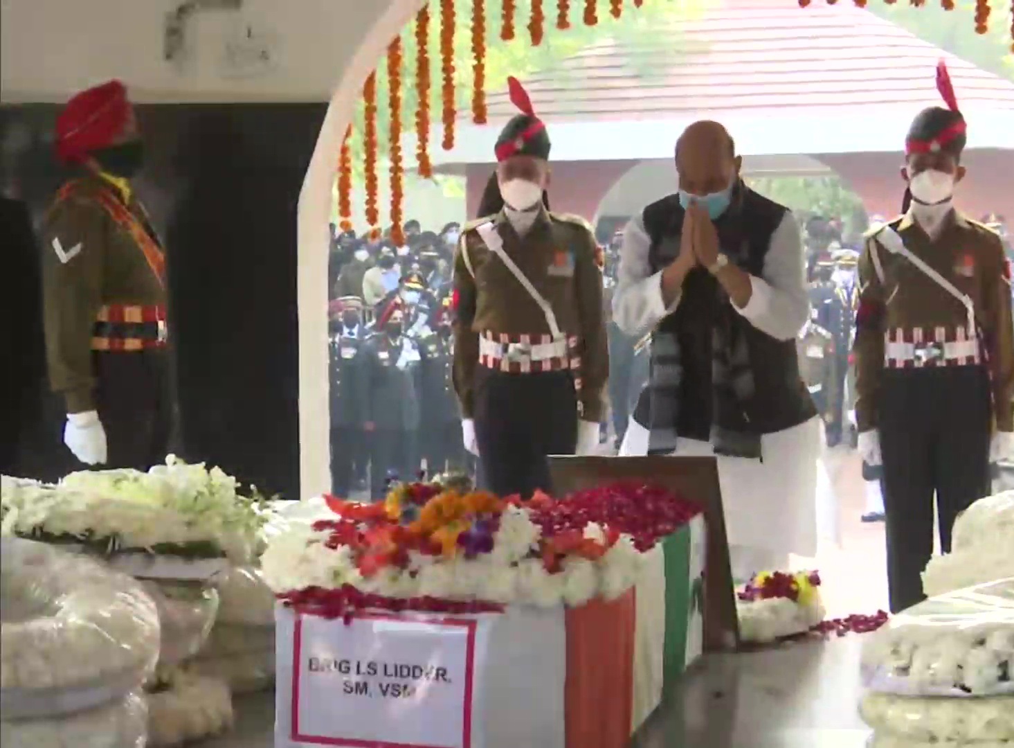 दिल्ली में रक्षा मंत्री राजनानाथ सिंह, एनएसए अजीत डोभाल और सेना के तीनों अंगों के प्रमुखों ने दिल्ली कैंट के बरार स्क्वायर में ब्रिगेडियर एलएस लिड्डर को श्रद्धांजलि दी।