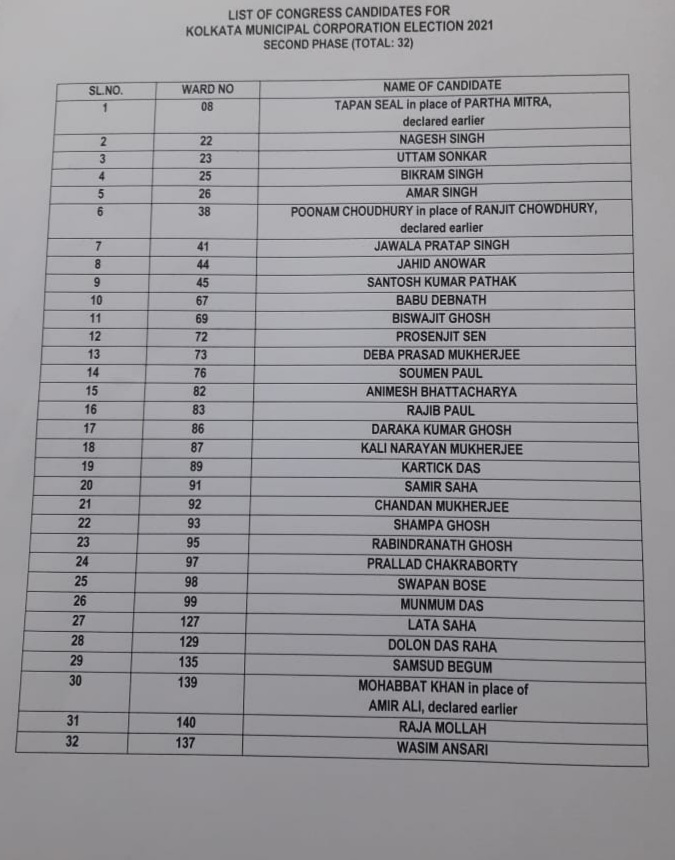 सनलाइट, कोलकाता। कोलकाता नगर निगम चुनाव के लिए कांग्रेस ने 32 प्रत्याशियों की सूची जारी के दी है। वार्ड 45 से संतोष पाठक, वार्ड 22 से नागेश सिंह, वार्ड 23 से उत्तम सोनकर को प्रत्याशी बनाया गया है। वार्ड 8 में पार्थ मित्रा की जगह तपन सील को प्रत्याशी बनाया गया है।