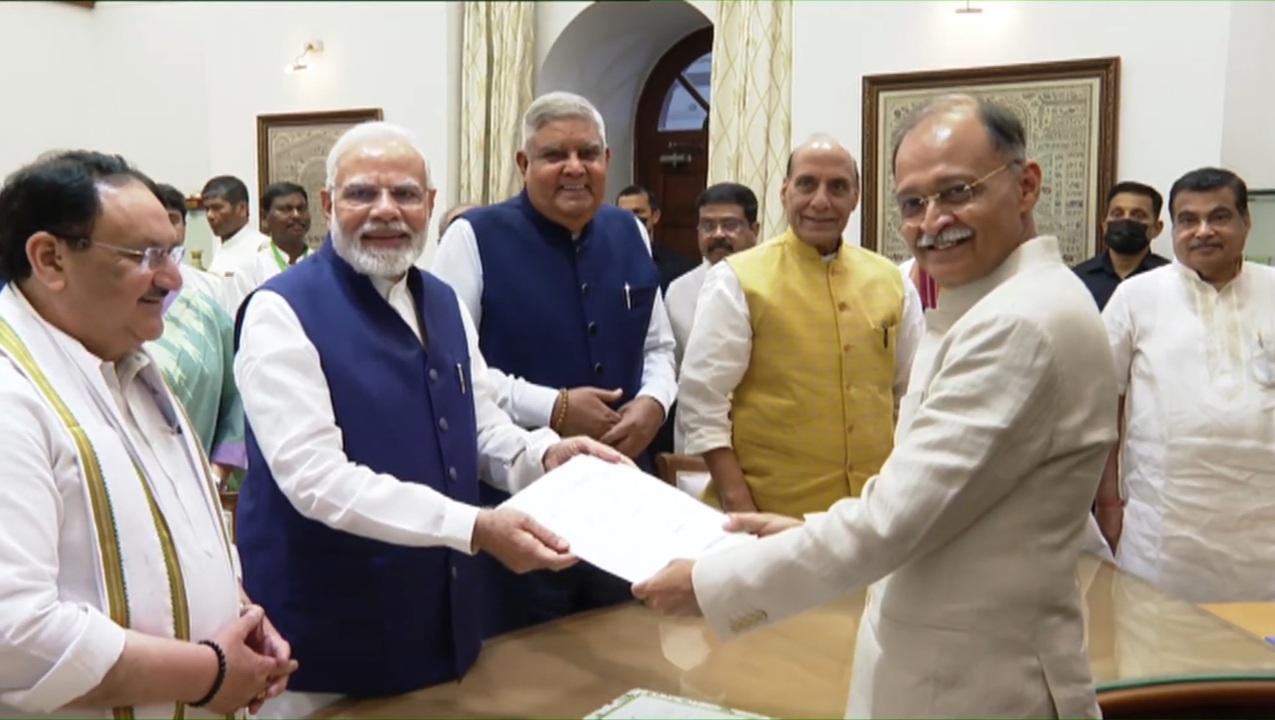 एनडीए के उपराष्ट्रपति उम्मीदवार जगदीप धनखड़ ने आज अपना नामांकन भरा। इस दौरान पीएम नरेंद्र मोदी, बीजेपी के राष्ट्रीय अध्यक्ष जेपी नड्डा, रक्षा मंत्री राजनाथ सिंह, गृह मंत्री अमित शाह और केंद्रीय मंत्री नितिन गडकरी मौजूद रहे। उल्लेखनीय है कि जगदीप धनखड़ ने राज्यपाल पद से इस्तीफा दे दिया है उनकी जगह मणिपुर के राज्यपाल को पश्चिम बंगाल का अतिरिक्त प्रभार दिया गया है।