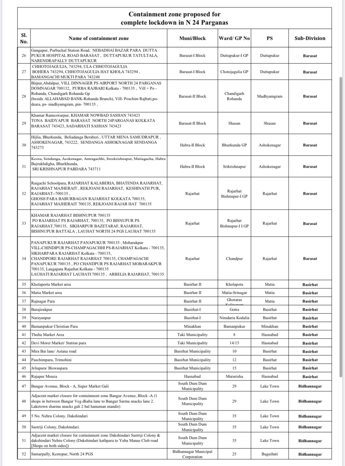 उत्तर 24 परगना में ये है कंटेन्मेंट जोन, देखें सूची बंगाल July 8, 2020sunlight सनलाइट। राज्य में 9 जुलाई शाम 5 बजे से कंटेन्मेंट जोन में लॉकडाउन की घोषणा कल की जा चुकी है। आज ममता बनर्जी ने कहा कि 7 दिनों के लिए लॉक डाउन किया जा रहा है जिसके बाद समीक्षा की जाएगी। उत्तर 24 परगना के कंटेन्मेंट जोन की सूची Post Views: 652 Share from here