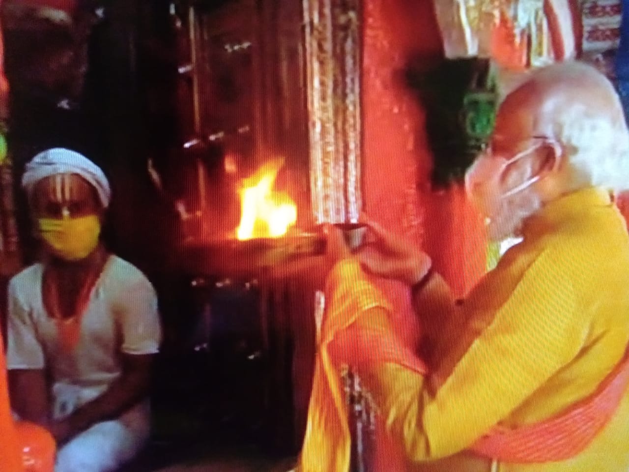 अयोध्या। अयोध्या में राम मंदिर निर्माण के भूमि पूजन कार्यक्रम में बुधवार को शामिल होने पहुंचे प्रधानमंत्री नरेन्द्र मोदी ने यहां हनुमानगढ़ी में दर्शन पूजन किया। प्रधानमंत्री इस दौरान मास्क पहने हुए थे। पीएम नरेन्द्र मोदी ने हनुमानगढ़ी में दर्शन और आरती की इस दौरान मुख्यमंत्री योगी आदित्यनाथ उनके साथ मौजूद रहे।