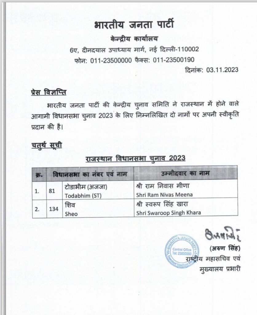 Rajasthan Election – बीजेपी ने जारी की 2 उम्मीदवारों की चौथी सूची राजस्थान November 3, 2023November 3, 2023sunlight Rajasthan Election के लिए बीजेपी ने दो उम्मीदवारों की चौथी सूची जारी की है। टोडाभीम विधानसभा से राम निवास मीना को टिकट दिया है। पार्टी ने शिव सीट से स्वरूप सिंह खारा को टिकट दिया है। Post Views: 436 Share from here