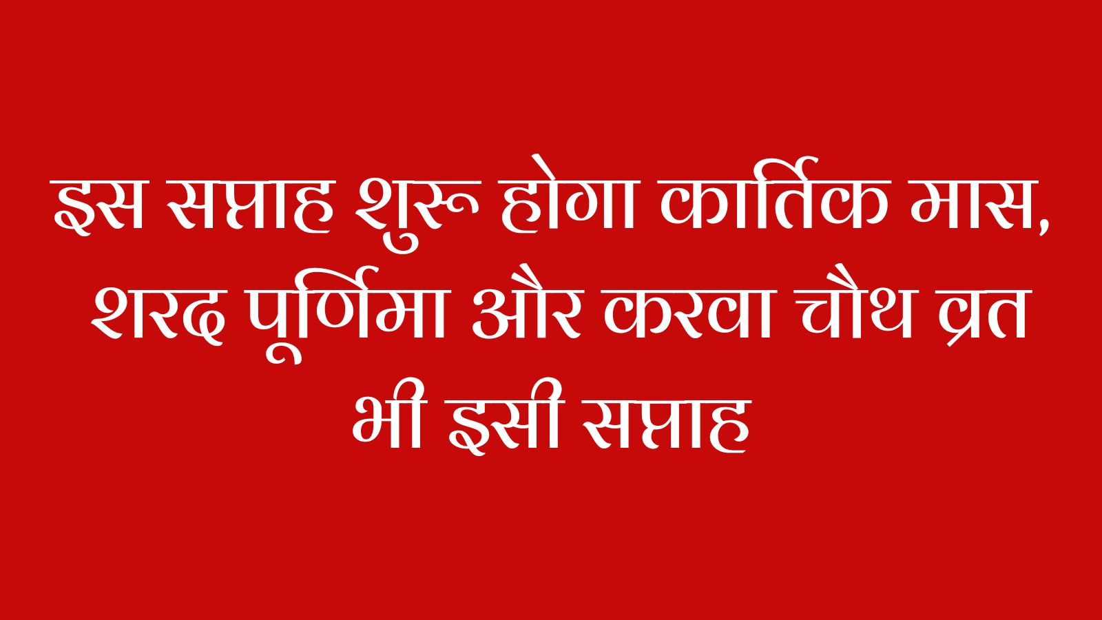 अक्टूबर के तीसरे हफ्ते में अश्विन मास खत्म होगा और कार्तिक महीने की शुरुआत हो जाएगी। इस सप्ताह 2 बड़े व्रत रहेंगे। इस हफ्ते बुधवार को अश्विन पूर्णिमा यानी शरद पूर्णिमा उत्सव मनाया जाएगा। तो वहीं कार्तिक मास आरंभ के साथ करवा चौथ का व्रत भी इसी सप्ताह होगा।
