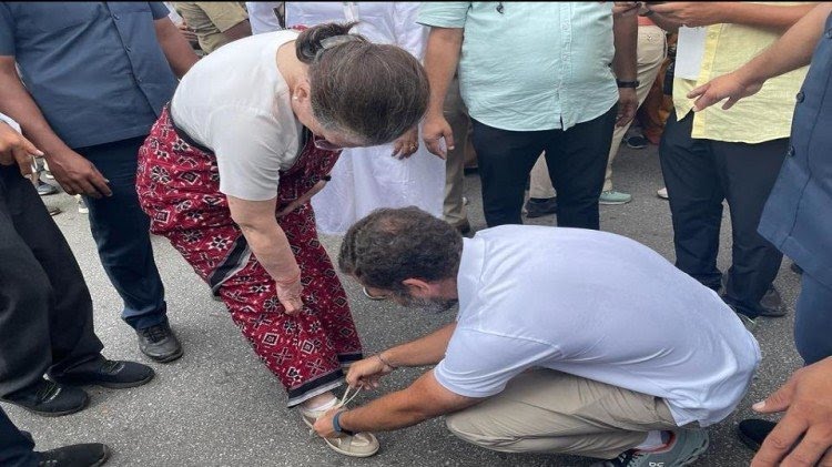 यात्रा के दौरान सोनिया गांधी के जूते लूज होने पर राहुल गांधी उन्हें बांधते नजर आए। इसका फोटो व वीडियो सोशल मीडिया में वायरल हो रहा है।