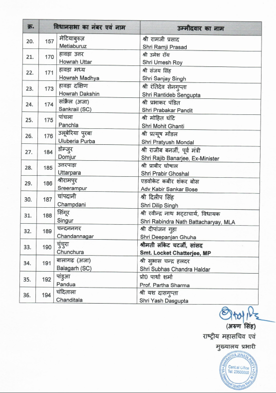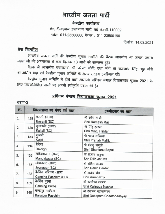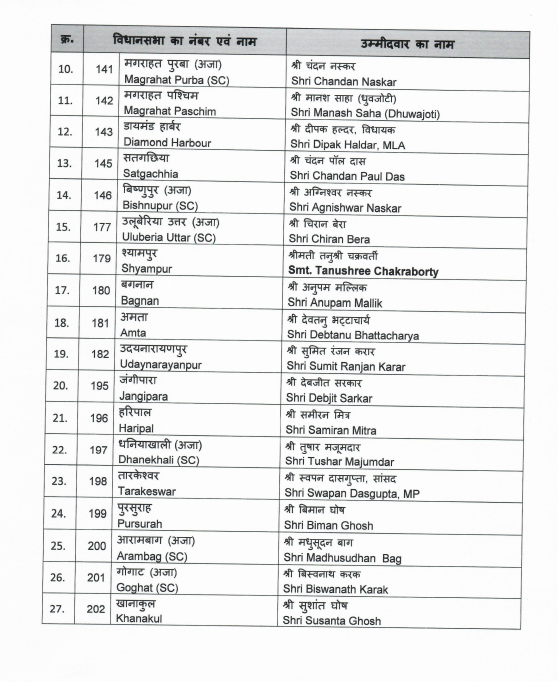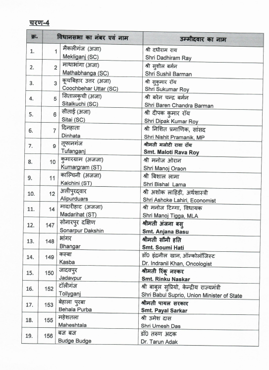पश्चिम बंगाल – भाजपा ने जारी की तीसरे और चौथे चरण के लिए प्रत्याशियों की सूची, सांसद बाबुल सुप्रियो और लॉकेट चटर्जी भी लड़ेंगे चुनाव बंगाल March 14, 2021sunlight सनलाइट। पश्चिम बंगाल विधानसभा चुनाव के लिए भाजपा ने तीसरे चौथे चरण के लिए उम्मीदवारों की घोषणा कर दी हैं। जिसमे मंत्री और सांसद भी है। हावड़ा उत्तर से उमेश राय, हावड़ा मध्य से संजय सिंह को हावड़ा दक्षिण से रंतिदेव सेनगुप्ता को टिकट दिया है। Post Views: 667 Share from here