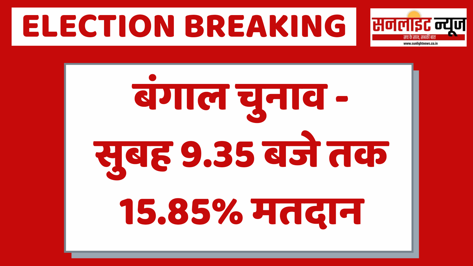 पश्चिम बंगाल – चौथे चरण में सुबह 9.35 बजे तक 15.85% मतदान बंगाल April 10, 2021sunlight पश्चिम बंगाल विधानसभा चुनाव के चौथे चरण में सुबह 9.35 बजे तक 15.85% मतदान हुए हैं। अलीपुरदुआर्स में 17.98%, कूचबिहार में 15.18%, दक्षिण 24 परगना में 13.15%, हावड़ा में 17.77% और हुगली में 17.05% मतदान हुए हैं। Post Views: 405 Share from here