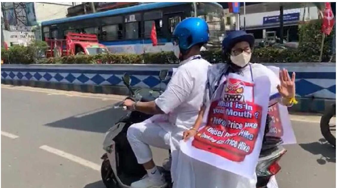 राज्य के शहरी विकास मंत्री फिरहाद हकीम स्कूटी चला रहे थे और सीएम पीछे बैठी हुई थीं। उनके गले में डीजल पेट्रोल की बढ़ी हुई कीमतों को कम करने की मांग और केंद्र सरकार के खिलाफ नारेबाजी वाले पोस्टर लटके हुए थे। आगे-आगे ममता बनर्जी की स्कूटी थी और उसके पीछे उनके समर्थकों का हुजूम बाइक पर चल रहा था। उन्हें देखने के लिए सड़क के दोनों ओर आम लोगों का तांता लगा हुआ था।