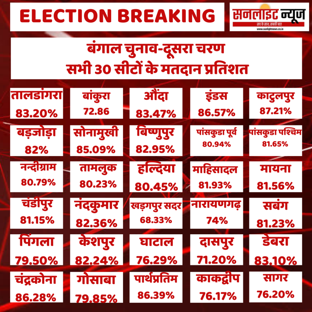 पश्चिम बंगाल दूसरे चरण में 80.43% मतदान बंगाल April 1, 2021sunlight पश्चिम बंगाल विधानसभा चुनाव के दूसरे चरण के लिए आज 30 सीटों पर मतदान हुए। रात 8.30 बजे तक टर्नआउट 80.43% रहा है। जिसमे पूर्व मेदिनीपुर से 81.23%, पश्चिम मेदिनीपुर से 78.05%, बांकुड़ा से 82.78% और दक्षिण 24 परगना से 79.66% मतदान हुए हैं। Post Views: 459 Share from here
